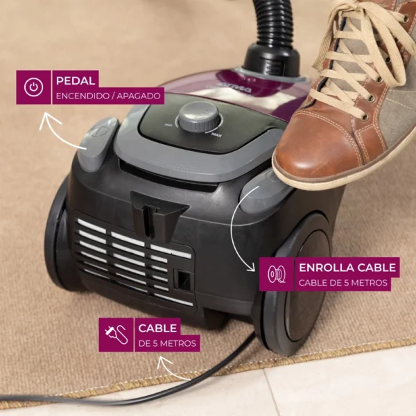 La Aspiradora Trineo Compact Power violeta 1.5 lts Atma tiene una potencia de 1500W y es ideal para cualquier tipo de piso ya que incluye un cepillo con cerdas ajustables.