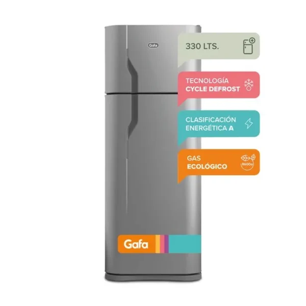 La Heladera con Freezer Gafa HGF368 AFP Plata con 330L de capacidad de almacenamiento, es la solución ideal para preservar alimentos y bebidas de todo tipo, de forma práctica y organizada. Su clasificación de Eficiencia Energética A, hace que la heladera sea más eficiente, con un menor consumo de energía. Además, cuenta con un gas más ecológico, que cuida el medioambiente y no daña la capa de ozono. Su tecnología Cycle Defrost, además de ser más económica, ayuda a preservar la humedad natural de tus alimentos. GRAN CAPACIDAD: Más espacio para almacenar y organizar alimentos, bebidas y todo tipo de envases con mayor facilidad. CLASIFICACIÓN ENERGÉTICA A: Menor consumo eléctrico para un mayor ahorro en tu cocina. GAS ECOLÓGICO: Cuida el medioambiente y la capa de ozono. ESTANTES DE ALTURA REGULABLE: Permiten adaptar el espacio interno de tu heladera. CAJÓN PARA FRUTAS Y VERDURAS: Ideal para mantener tus frutas y verduras frescas por más tiempo, y al alcance de la mano. MANIJA ERGONÓMICA: Con diseño innovador que facilita la apertura de la heladera. CUBETERAS: Ideal para mantener sus bebidas a la temperatura adecuada. BANDEJA PARA HUEVOS: Dos bandejas con capacidad para 12 huevos.