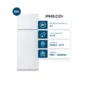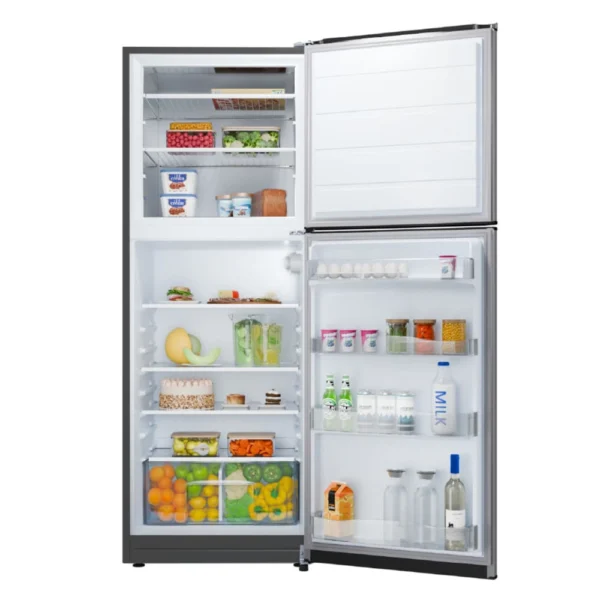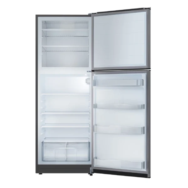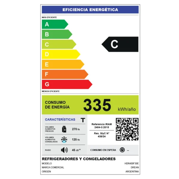 Heladera con freezer cíclica. Eficiencia energética C. Color gris. Gas R600a. Capacidad bruta 397 litros. Capacidad neta 395 litros. Deshielo manual. Estantes de vidrio templado regulables en altura. Anaqueles en contrapuerta. Cajón para frutas y verduras. Control de temperatura interior. Luz LED.