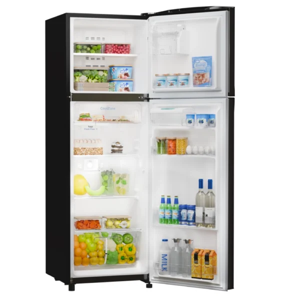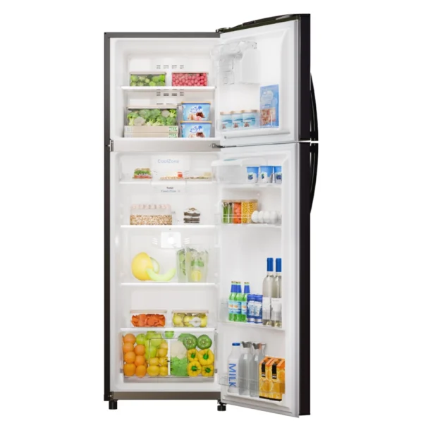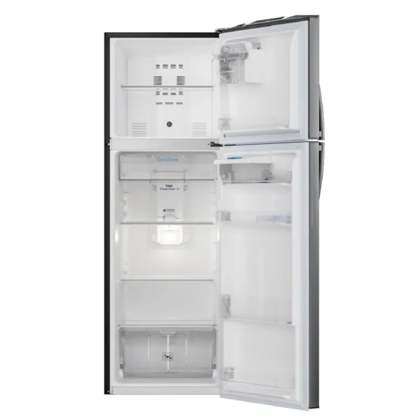 Heladera con freezer no frost. Color steel. Capacidad bruta de 300 litros. Deshielo automático. Sistema Total Fresh Flow. Estantes de vidrio templado. Anaqueles en puertas. Dispenser de agua. Smart factory ice. Cajón para delicados y crisper para frutas y verduras. Luz LED. Sistema antihuellas.
