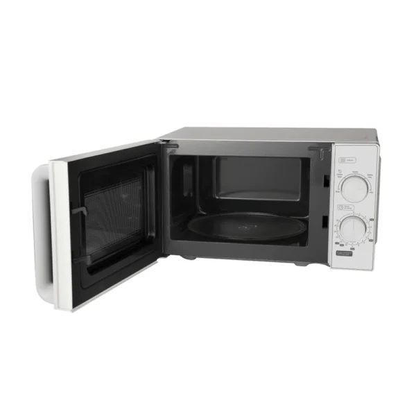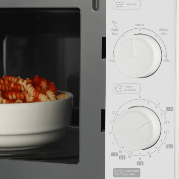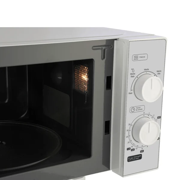 Horno Microondas Smartlife Mecánico SL-MWO20MMW Blanco – 20L. El horno microondas Smartlife SL-MWO20MMW es la opción ideal para quienes buscan practicidad y funcionalidad en la cocina. Con su diseño en color blanco clásico, se integra fácilmente en cualquier ambiente y aporta un toque limpio y moderno.Este modelo cuenta con control mecánico mediante perillas giratorias, lo que permite un uso simple e intuitivo. Su capacidad de 20 litros es perfecta para calentar, cocinar o descongelar porciones diarias con comodidad. Además, ofrece funciones como descongelado por peso o tiempo, adaptándose a diferentes necesidades. La bandeja giratoria de vidrio templado garantiza una cocción homogénea, mientras que su interior esmaltado gris es fácil de limpiar y resistente al uso diario. Su luz interior halógena te permite visualizar el contenido en todo momento sin necesidad de abrir la puerta.