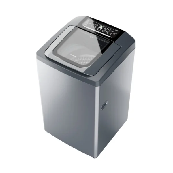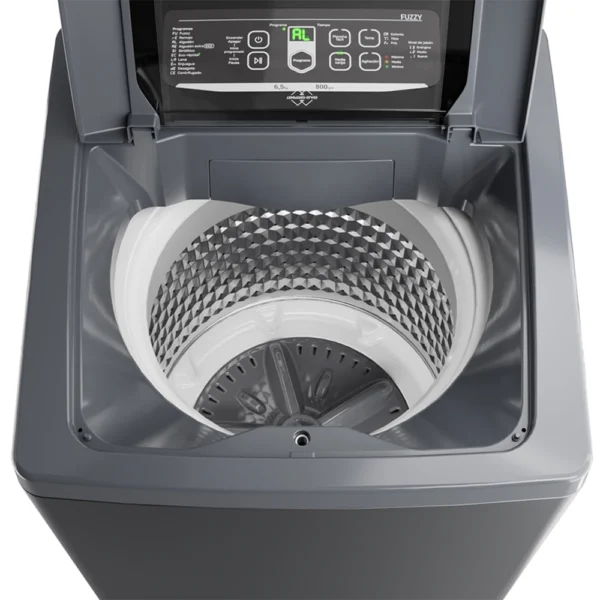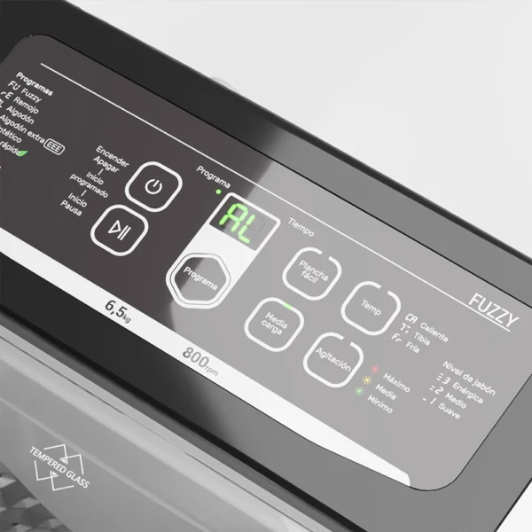 Lavarropas automático de carga superior. Capacidad de 6,5 Kg. Color gris. Velocidad de 800 RPM. Eficiencia energética A+. Sistema de lavado oriental. Display LED digital. Tapa de vidrio templado. Alarma fin de lavado. Incluye función Fuzzy, media carga y plancha fácil. Tambor de acero inoxidable.