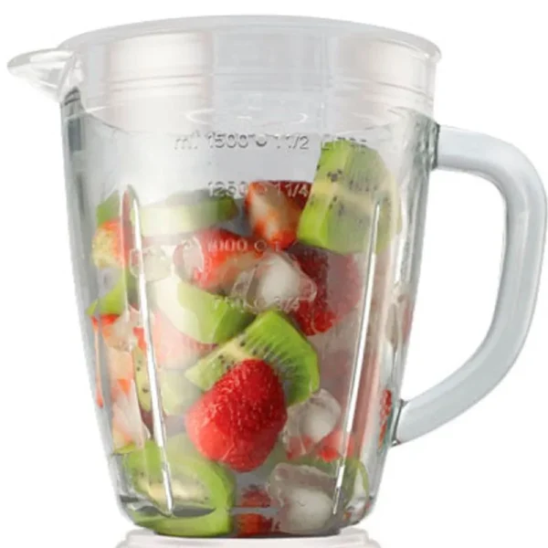 Jarra de Vidrio de Alta Resistencia: Fabricada con vidrio de alta calidad, la jarra ofrece una mayor durabilidad y resistencia a las rayaduras y manchas. A diferencia de las jarras de plástico, el vidrio no absorbe olores ni sabores, lo que garantiza que tus preparaciones conserven su sabor original. Además, es más higiénica y fácil de limpiar.