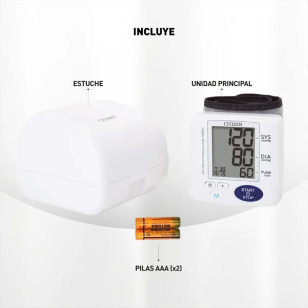 Tensiómetro digital Automático de muñeca. Marca Citizen. Modelo CH-617. Manga de 13,5 cm a 19,5cm. Las fotografías y gráficas son meramente ilustrativas. Los productos podrán sufrir modificaciones en sus accesorios y/o colores sin previo aviso.